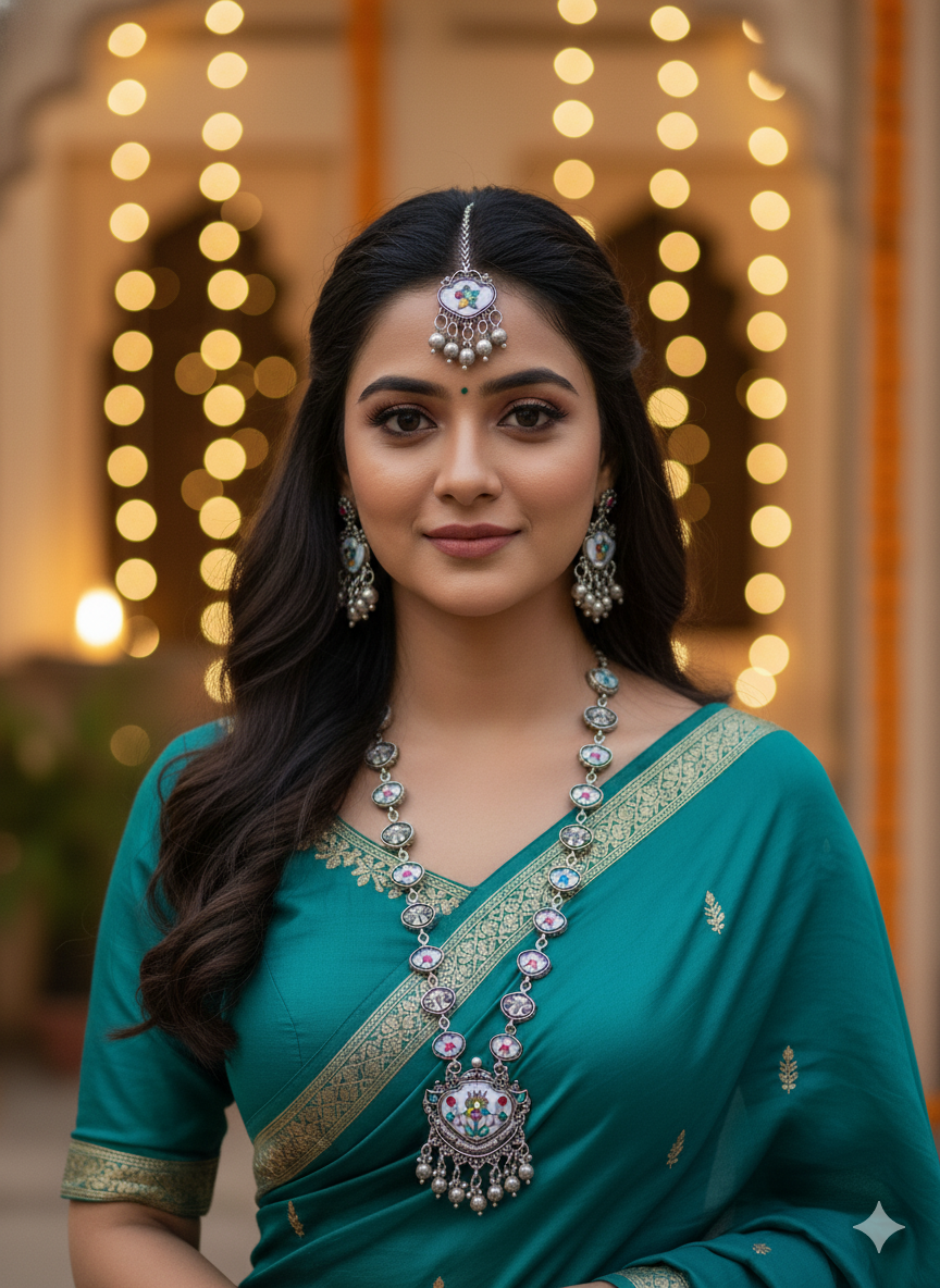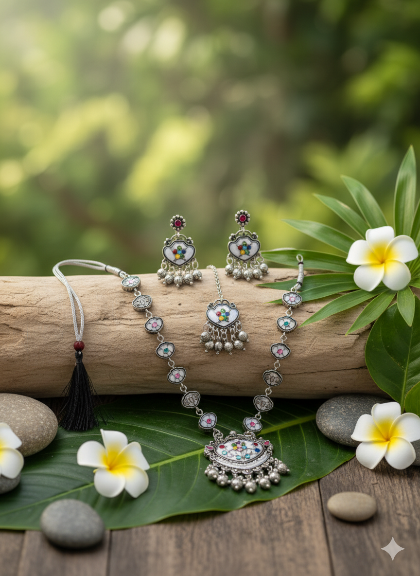 This oxidized silver long necklace set blends traditional craftsmanship with playful charm, featuring a heart-shaped motif adorned with colorful stone accents and delicate dangling ghungroo beads. The elongated chain is detailed with repeating heart links, creating a graceful flow that leads to a striking statement pendant. Paired with matching earrings and a coordinating maang tikka, the set is finished with an adjustable thread closure for comfortable wear, making it a perfect choice for festive celebrations, cultural events, and boho-inspired ethnic looks.