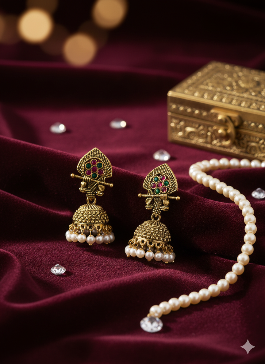The origins of Jhumka trace back to ancient temple sculptures from the Chola dynasty, around the 3rd century BCE. Over centuries, the style evolved under royal and Mughal influences, with each region adapting its own motifs and materials, such as meenakari enamel from Rajasthan, intricate filigree from Orissa, pearl elements in Hyderabad, and Kemp stones from Tamil Nadu.Jhumkas are traditionally believed to symbolize spirituality, eternal life, and to bring positive energy through the gentle sound they produce.