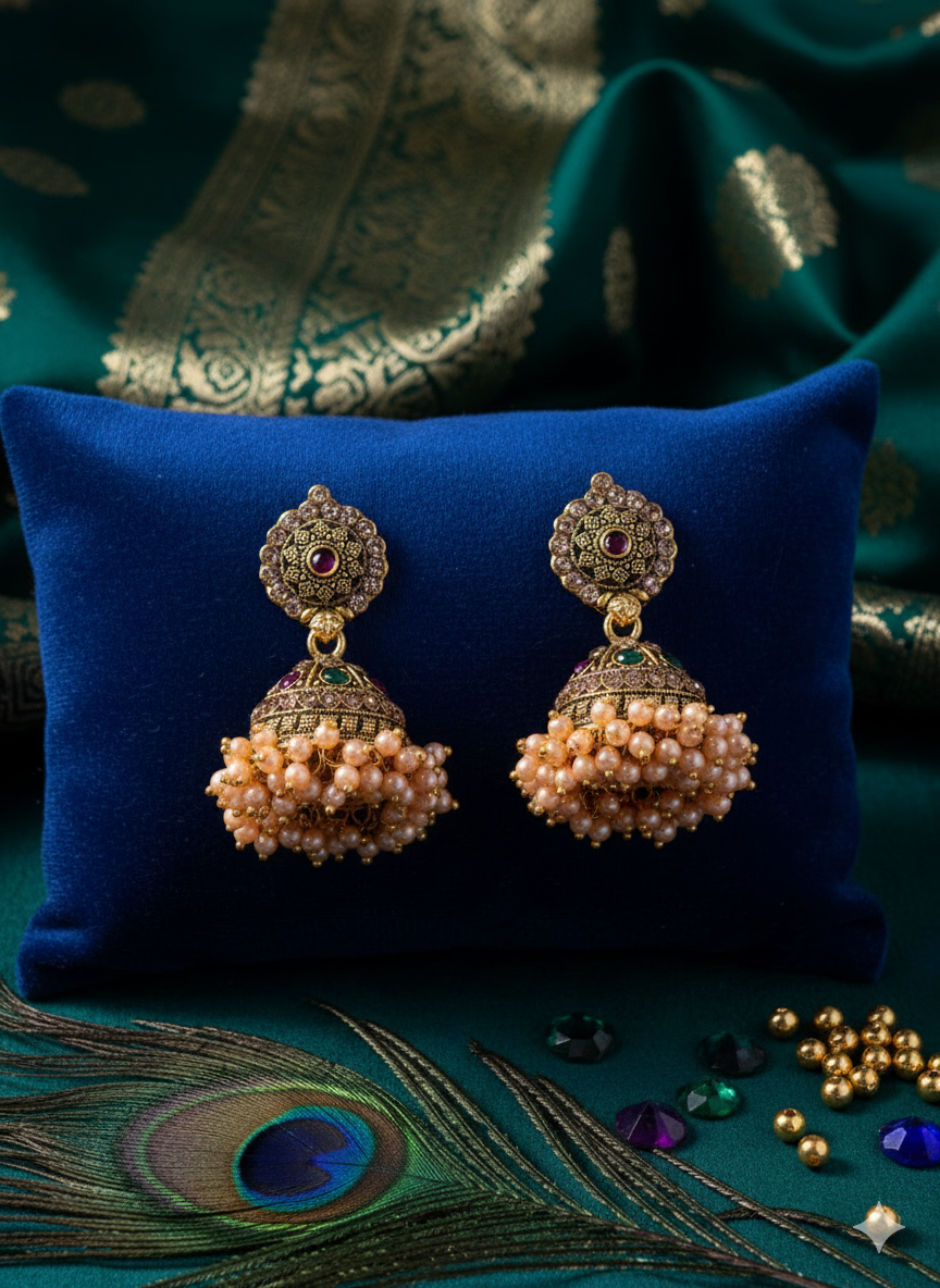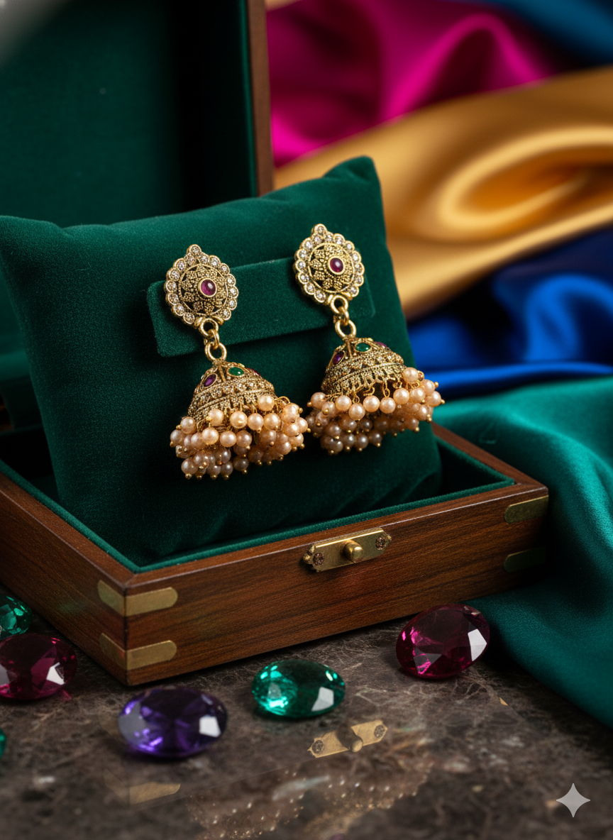 The origins of Jhumka trace back to ancient temple sculptures from the Chola dynasty, around the 3rd century BCE. Over centuries, the style evolved under royal and Mughal influences, with each region adapting its own motifs and materials, such as meenakari enamel from Rajasthan, intricate filigree from Orissa, pearl elements in Hyderabad, and Kemp stones from Tamil Nadu.Jhumkas are traditionally believed to symbolize spirituality, eternal life, and to bring positive energy through the gentle sound they produce.