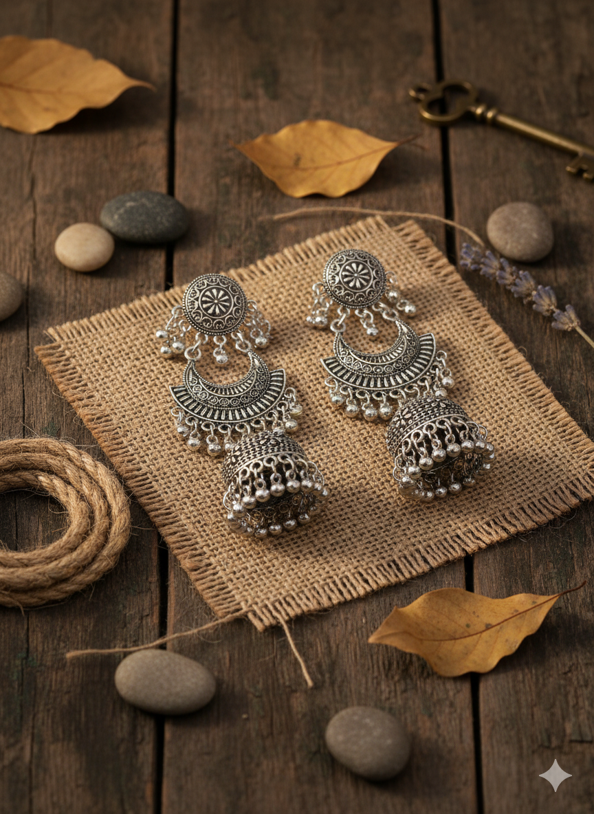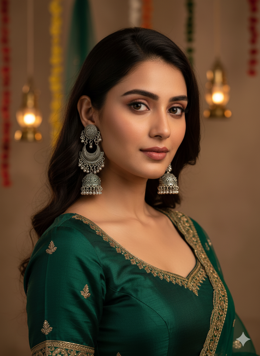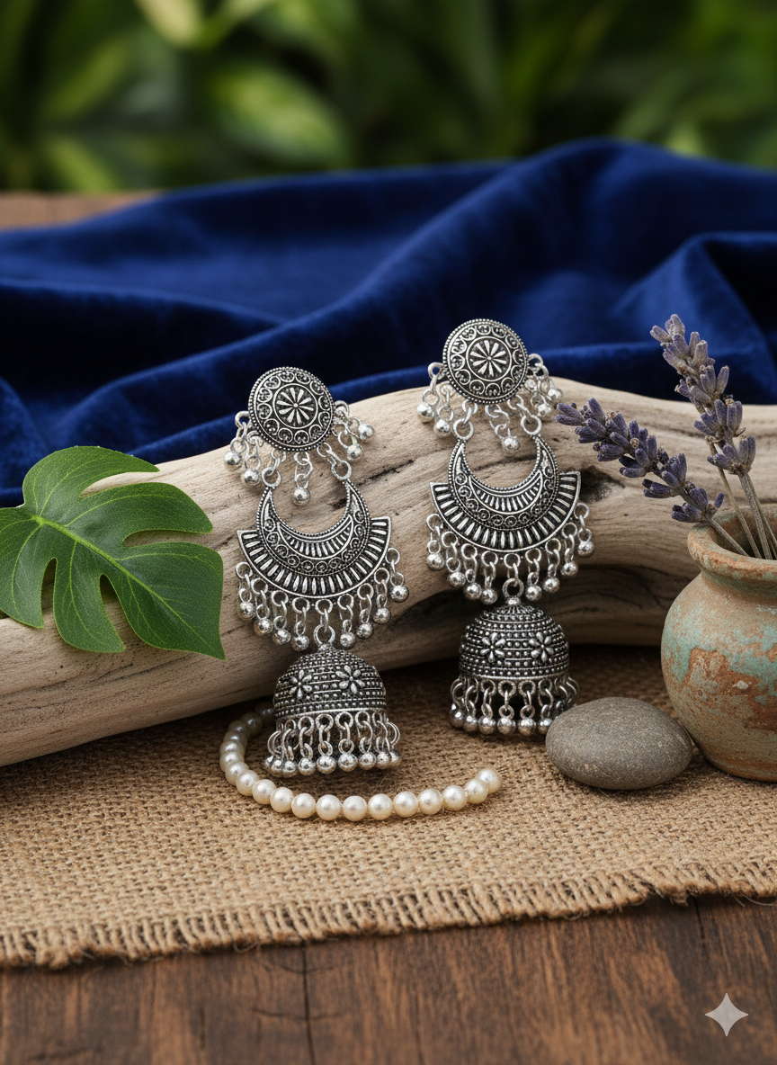 The origins of Jhumka trace back to ancient temple sculptures from the Chola dynasty, around the 3rd century BCE. Over centuries, the style evolved under royal and Mughal influences, with each region adapting its own motifs and materials, such as meenakari enamel from Rajasthan, intricate filigree from Orissa, pearl elements in Hyderabad, and Kemp stones from Tamil Nadu.Jhumkas are traditionally believed to symbolize spirituality, eternal life, and to bring positive energy through the gentle sound they produce.